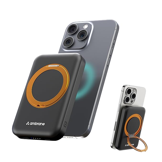 Ambrane MagSafe Wireless 10000mAh Fast Charging Power Bank with Mobile Stand, Strong Magnet, 22.5W Output for iPhone 12 & Above, Android & Other Qi Enabled Device + Magnetic Ring (Mount, Black)